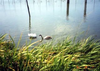 | 手前の2羽がコハクチョウです(04年2月9日撮影) | コハクチョウ2羽、優雅です。(04年2月9日撮影) | |