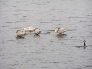 | オオハクチョウの幼鳥4羽をすぐ側で発見、コブハクチョウにもコハクチョウにも人様にも知らん顔です (05年1月25日撮影) |